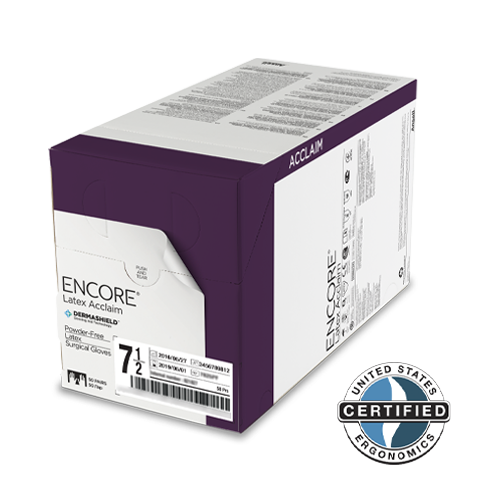 Erhöhter ergonomischer Komfort: Die einzigartige anatomische Formgebung und die weiche Latexformulierung dieser puderfreien OP-Handschuhe haben zu einer Zertifizierung für ergonomischen Komfort durch United States Ergonomics geführt. Ausgezeichnete GriffigkeitENCORE® Latex Acclaim verfügt über eine glatte Außenfläche mit einer mikrostrukturierten Oberfläche, die einen sicheren Halt von medizinischen Instrumenten ermöglicht, insbesondere bei feuchten Bedingungen.